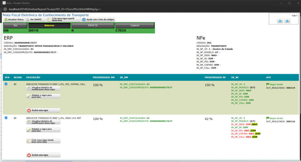 Foi realizado o ajuste onde o Ábax não estava validando os novos campos de CTEOS na consulta de dados da NFe, na tela de Classificação Fiscal de CTe.