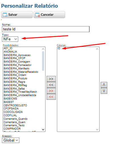 O campo ID não estava presente nos relatórios NFe, foi adicionado na tela de personalizar e gerar relatórios.