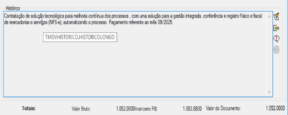 Foi realizada uma correção no envio do histórico longo para o ERP. Anteriormente, era enviada apenas a descrição do serviço, agora, as informações são obtidas diretamente do pedido de compras.