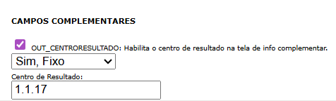 Foi criado uma opção através da Forma de Recebimento de informar o Centro de Resultado como fixo no Ábax. Ele é configurado pelo campo OUT_CENTRORESULTADO, onde o usuário pode informar o código do Centro de Resultado que será preenchido automaticamente na tela da Info Complementar.