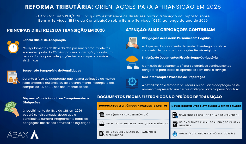 O ano de 2026 será um ano de transição, com foco na adaptação dos contribuintes, dos sistemas e das administrações tributárias, sem efeitos financeiros imediatos, desde que as obrigações acessórias sejam devidamente cumpridas.